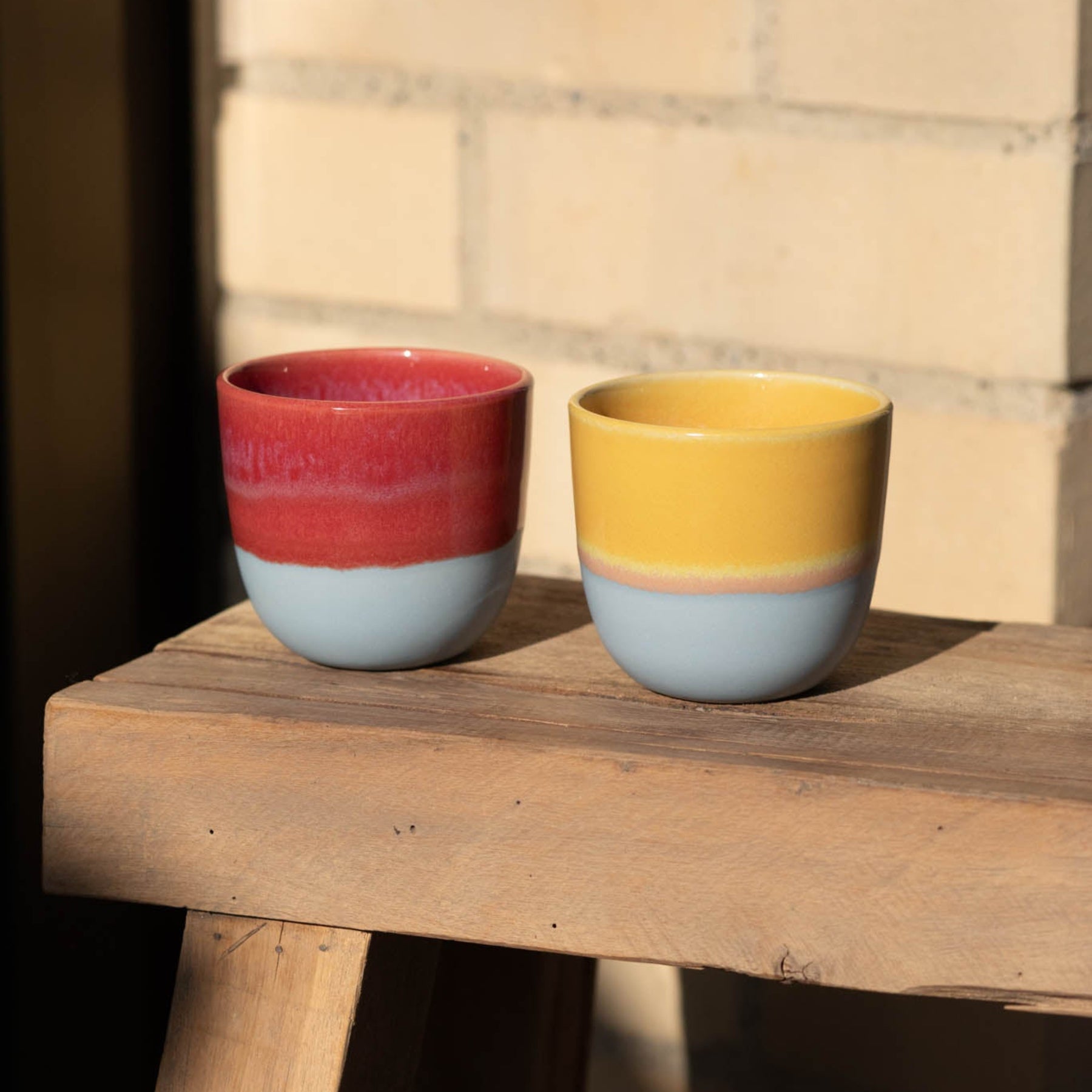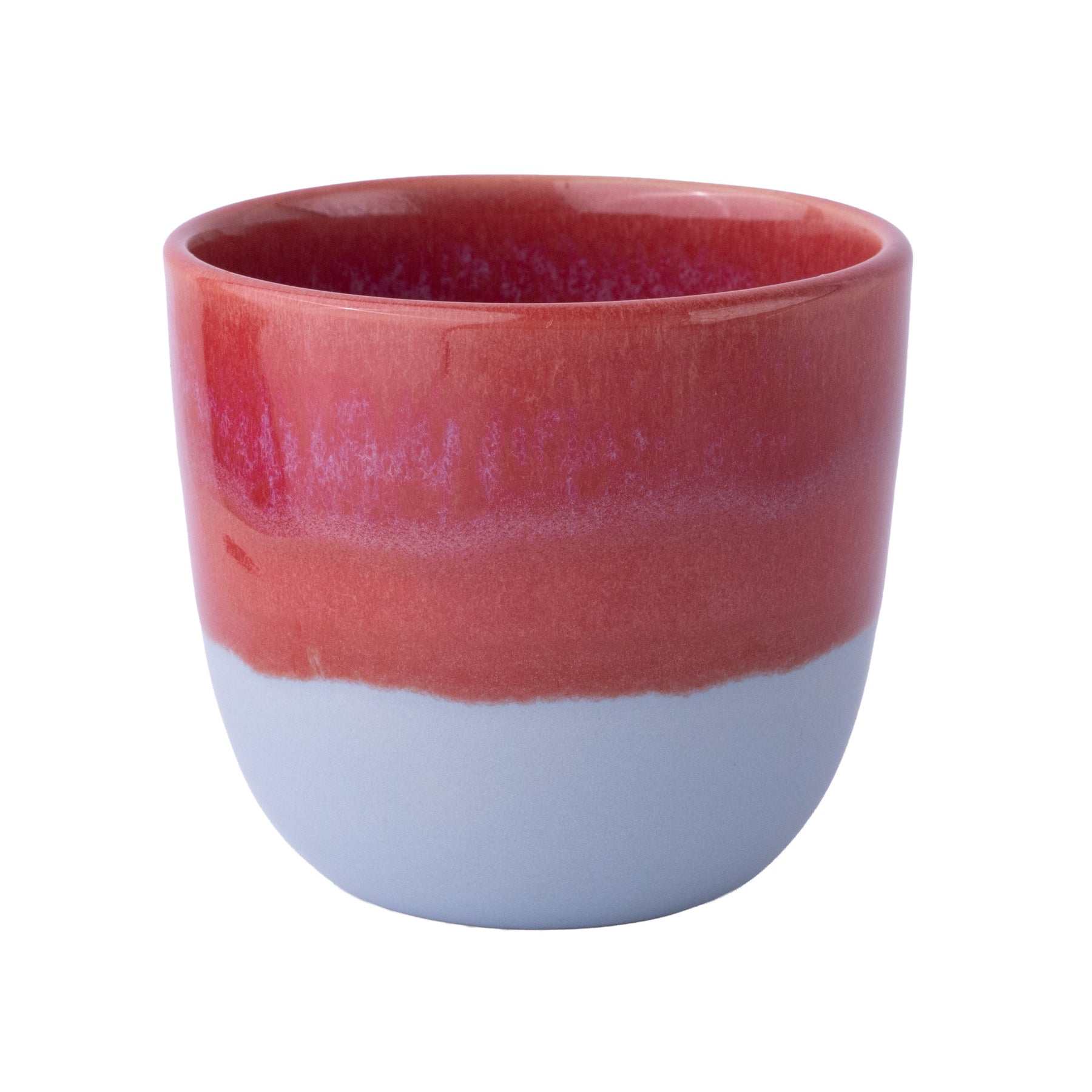This two-tone coffee cup in red and light blue is a real eye-catcher on any table. The double dipping in colored glazes creates the unique color block look, which gives each colored coffee cup an individual touch. The warm red and cool light blue create an exciting contrast, perfect for anyone who loves bold colors and modern design.